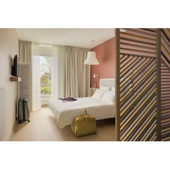 • Un sommeil sans nuage : Lit double 160cm x 200cm en fibres naturelles conçu en exclusivité pour OKKO Hotels par Cocomat • Couette et oreillers moelleux en plume traités écologiquement contre les allergies • Draps italiens en lin et coton froissés